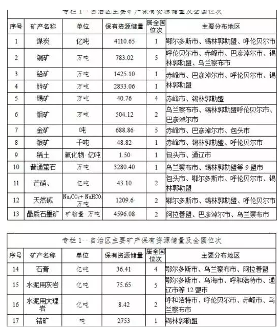 自治區(qū)礦產資源具有礦產種類多、分布較集中、資源潛力大的特點。以煤為主的能源礦產資源優(yōu)勢明顯,全區(qū)煤炭勘查累計估算資源總量為8518.80億噸,其中保有資源儲量為4110.65億噸,居全國第一位。已探獲的鈾資源量位居全國首位,已初步形成我國北方重要的鈾礦資源勘查開發(fā)基地。全區(qū)頁巖氣資源潛力巨大,鄂爾多斯地區(qū)頁巖氣預測資源量11.2萬億立方米。全區(qū)煤層氣資源豐富,分布廣、數(shù)量大、類型多,據(jù)國家最新煤層氣資源評價數(shù)據(jù),全區(qū)2000米以淺煤層氣潛在資源總量約為5.8萬億立方米;地熱和淺層地溫能資源豐富,但全區(qū)非常規(guī)能源礦產總體勘查和開發(fā)利用程度較低,尚未大規(guī)模開發(fā)利用。有色金屬和貴金屬礦產資源分布集中,有色金屬以銅、鉛、鋅、錫、鉬礦為主,貴金屬以金、銀為主,集中分布于中西部狼山—烏拉山地區(qū)和東部的大興安嶺中南段,具有規(guī)模化開采的天然稟賦條件。稀土資源得天獨厚,已探明的稀土氧化物保有資源儲量占全國98%以上,位居全國第一,具有占領國內市場的潛力。非金屬礦產種類繁多,分布廣泛,多數(shù)可以保證國家與自治區(qū)經濟發(fā)展的需要。